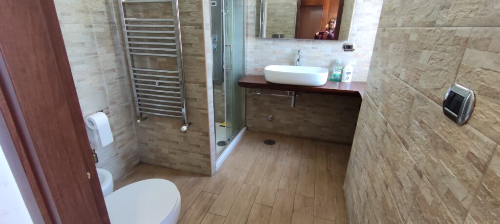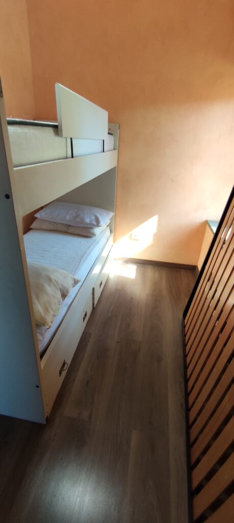 Salendo al primo piano si sviluppa la zona notte: una camera matrimoniale padronale con ripostiglio/guardaroba e una cameretta singola, ideale come stanza per un bambino, studio o stanza ospiti. Da qui la vista è davvero speciale: lo sguardo corre sulle colline e sul paesaggio fino all’orizzonte.